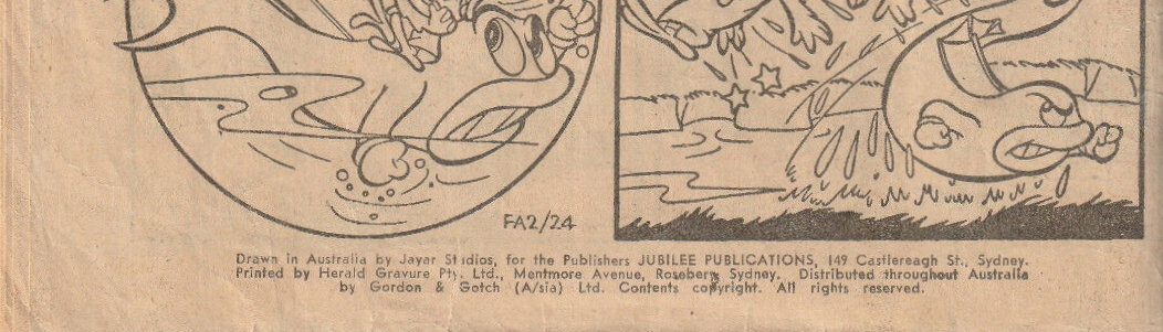 Drawn in Australia by Jayar Studios, for the Publishers Jubilee Publications, 149 Castlereagh St., Sydney. Printed by Herald Gravure Pty. Ltd., Mentmore Avenue, Rosebery, Sydney. Distributed throughout Australia by Gordon & Gotch (A/sia) Ltd. Contents copyright. All rights reserved.