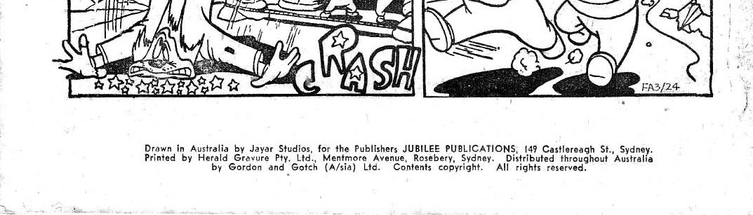 Drawn in Australia by Jayar Studios, for the publishers Jubilee Publications, 149 Castlereagh St., Sydney. Printed by Herald Gravure Pty. Ltd., Mentmore Avenue, Rosebery, Sydney. Distributed throughout Australia by Gordon and Gotch (A/sia) Ltd. Contents copyright. All rights reserved.
