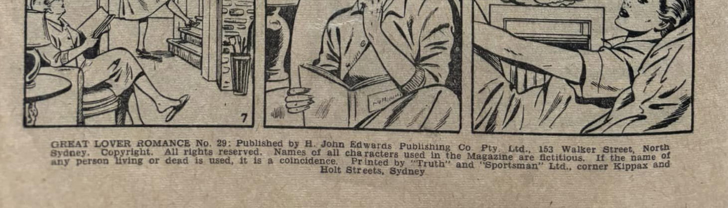 Great Lover Romance No. 29: Published by H. John Edwards Publishing Co. Pty. Ltd., 153 Walker Street, North Sydney. Copyright. All rights reserved. Names of all characters used in the Magazine are fictitious. If the name of any person living or dead is used, it is a coincidence. Printed by "Truth" and "Sportsman" Ltd., corner Kippax and Holt Streets, Sydney.