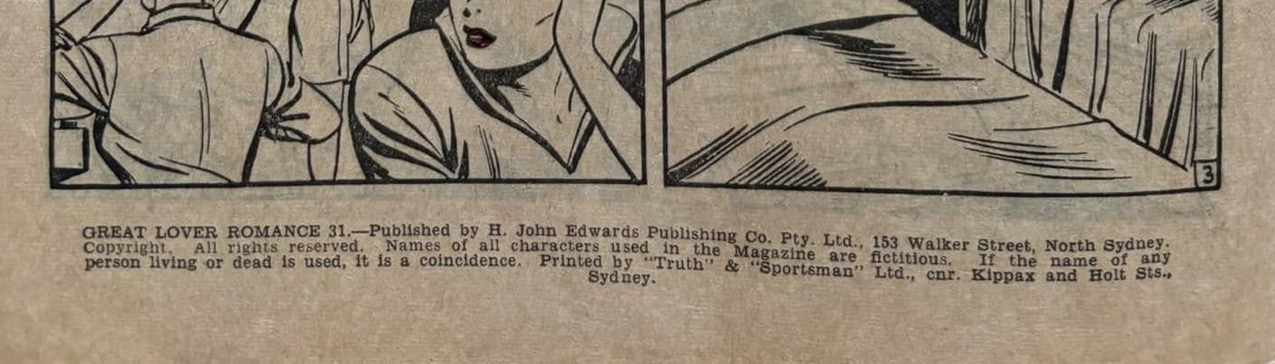 Great Lover Romance 31.--Printed by H. John Edwards Publishing Co. Pty. Ltd., 153 Walker St., North Sydney. Copyright. All rights reserved. Names of all characters used in the magazine are fictitious. If the name of any person, living or dead, is used, it is a conincidence. Printed by "Truth" and "Sportsman" Ltd., cnr. Kippax and Holt Streets, Sydney.