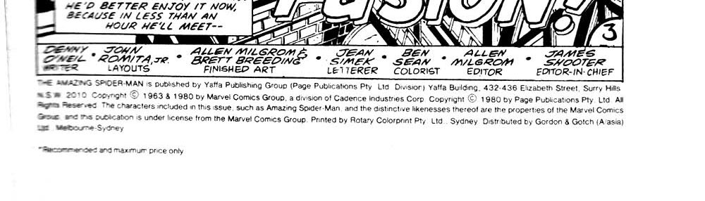 The Amazing Spider-Man is published by Yaffa Publishing Group (Page Publications Pty. Ltd. Division) Yaffa Building, 432-436 Elizabeth Street, Surry Hills. N.S.W. 2010. Copyright © 1963 & 1980 by Marvel Comics Group, a division of Cadence Industries Corp. Copyright © 1980 by Page Publications Pty. Ltd. All rights reserved. The characters included in this issue, such as Amazing Spider-Man, and the distinctive likenesses thereof are the properties of the Marvel Comics Group, and this publication is under license from the Marvel Comics Group. Printed by Rotary Colorprint Pty. Ltd., Sydney. Distributed by Grodon & Gotch (A/asia) Ltd., Melbourne-Sydney.