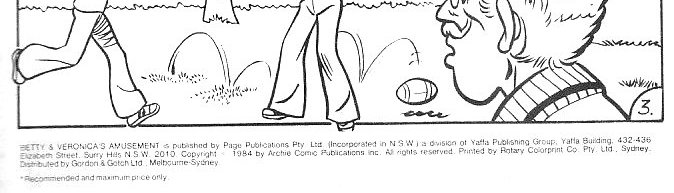 Betty & Veronica's Amusement is published by Page Publications Pty. Ltd. (Incorporated in N.S.W.) a division of Yaffa Publishing Group, Yaffa Building, 432-436 Elizabeth Street, Surry Hills, N.S.W. 2010. Copyright © 1984 by Archie Comic Publications Inc. All rights reserved. Printed by Rotary Colorprint Co. Pty. Ltd., Sydney. Distributed by Gordon & Gotch Ltd., Melboune-Sydney.