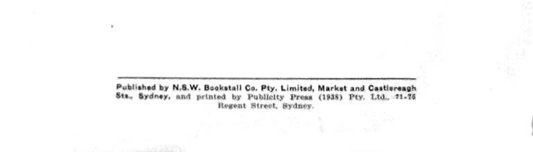 Published by N.S.W. Bookstall Co. Pty. Limited, Market and Castlereagh Sts., Sydney, and printed by Publicity Press (1938) Pty. Ltd., 71-75 Regent Street, Sydney.