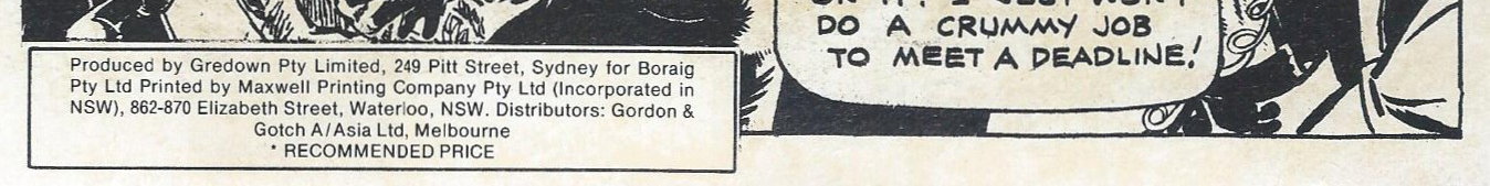 Produced by Gredown Pty Limited, 249 Pitt Street, Sydney for Boraig Pty Ltd. Printed by Maxwell Printing Company Pty Ltd (Incorporated in NSW), 862-870 Elizabeth Street, Waterloo, NSW. Distributors: Gordon & Gotch A/Asia Ltd, Melbourne.