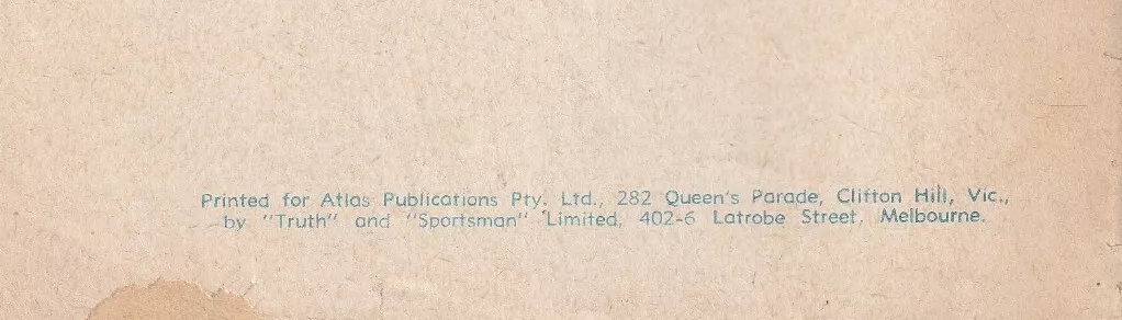 Printed for Atlas Publications Pty. Ltd., 383 Queen's Parade, Clifton Hill, Vic., by "Truth" and "Sportsman" Limited, 402-6 Latrobe Street, Melbourne.