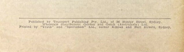 Published by Transport Publishing Pty. Ltd., of 26 Hunter Street, Sydney. Wholesale Distributors: Gordon and Gotch (Australasia) Ltd. Printed by "Truth" and "Sportsman" Ltd., corner Kippax and Holt Streets, Sydney.
