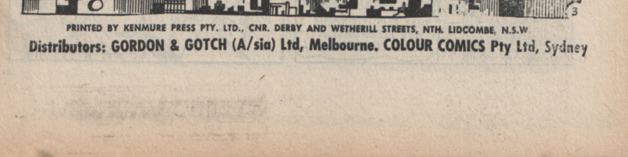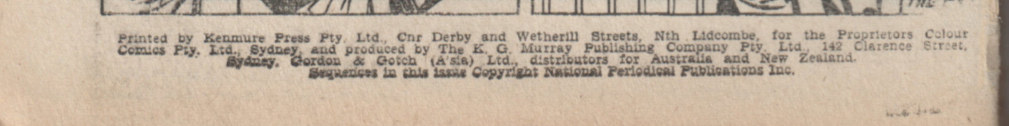 Printed by Kenmure Press Pty. Ltd., Cnr Derby and Wetherill Streets, Nth Lidcombe, for the Proprietors Colour Comics Pty. Ltd., Sydney, and produced by The K. G. Murray Publishing Company Pty. Ltd., 142 Clarence Street, Sydney. Gordon & Gotch (A'sia) Ltd., distributors for Australia and New Zealand. Sequences in this issue copyright National Periodical Publications Inc.