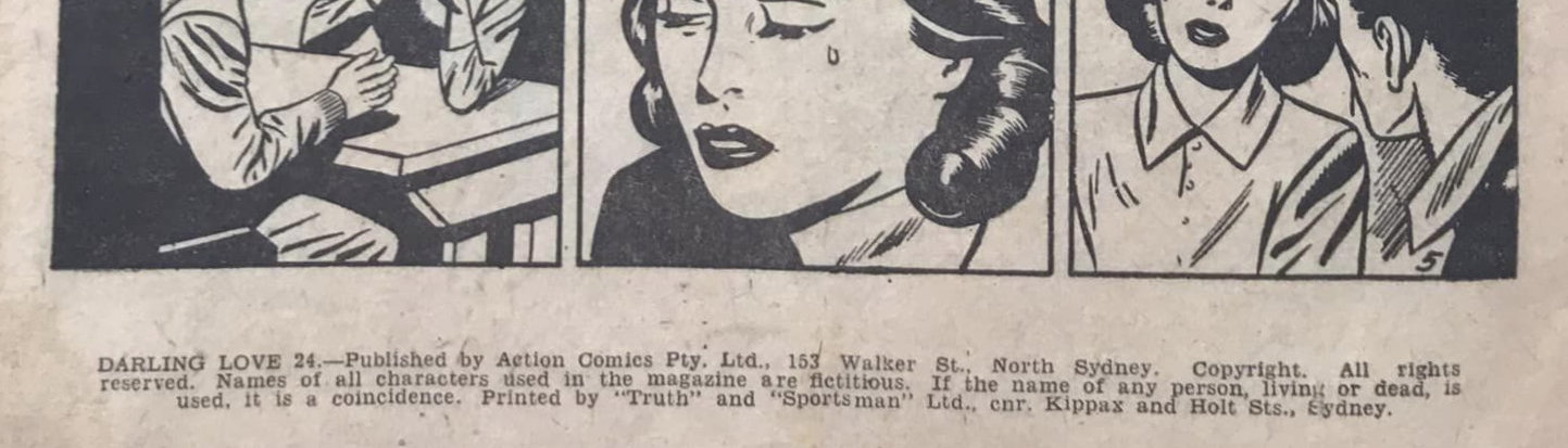 Darling Love 24.--Published by Action Comics Pty. Ltd., 153 Walker St., North Sydney. Copyright. All rights reserved. Names of all characters used in the magazine are fictitious. If the name of any person, living or dead, is used, it is a coincidence. Printed by "Truth" and "Sportsman" Ltd., cnr. Kippax and Holt Streets, Sydney.