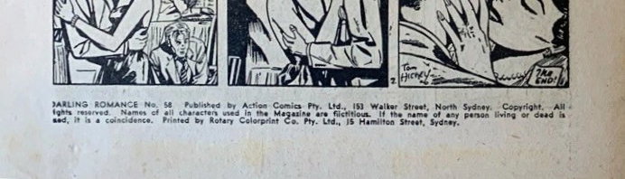 Darling Romance No. 58. Publishede by Action Comics Pty. Ltd., 153 Walker Street, North Sydney. Copyright. All rights reserved. Names of all characters used in the magazine are fictitious. If the name of any person living or dad is used, it is a coincidence. Printed by Rotary Colorprint Co. Pty. Ltd., 15 Hamilton Street, Sydney.