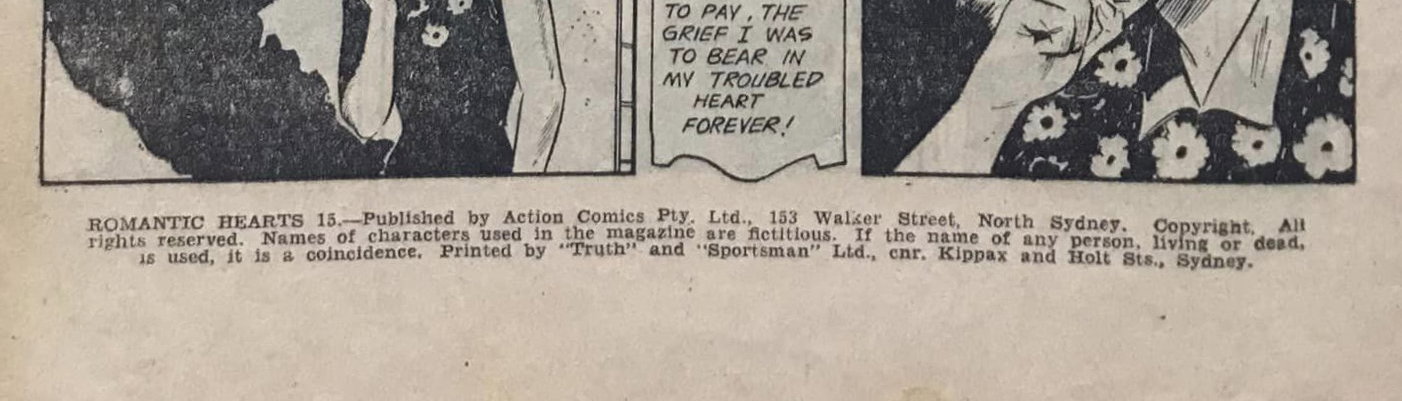 Romantic Hearts 15.--Published by Action Comics Pty. Ltd., 153 Walker Street, North Sydney. Copyright. All rights reserved. Names of characters used in the magazine are fictitious. If the name of any person, living or dea, is used, it is a coincidence. Printed by 'Truth' and 'Sportsman' Ltd., cnr. Kippax and Holt Sts., Sydney.