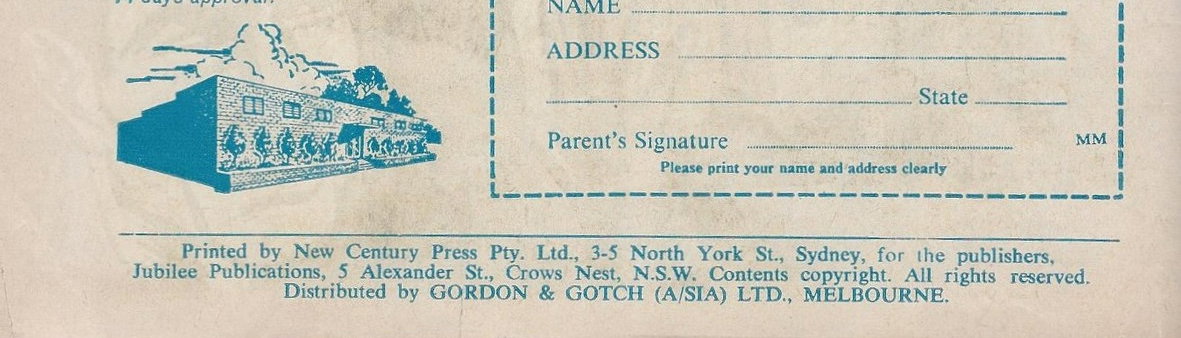 Printed by New Century Press Pty. Ltd., 3-5 North York St., Sydney, for the publishers, Jubilee Publications, 5 Alexander St., Corws Nest, N.S.W. Contents copyright. All rights reserved. Distributed by Gordon & Gotch (A/sia) Ltd., Melbourne.