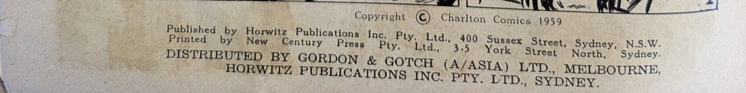 Copyright © Charlton Comics 1959. Published by Horwitz Publications Inc. Pty. Ltd., 400 Sussex Street, Sydney, N.S.W. Printed by New Century Press Pty. Ltd., 3-5 York Street North, Sydney. Distributed by Gordon & Gotch (A/asia) Ltd., Melbourne, Horwitz Publications Inc. Pty. Ltd., Sydney.