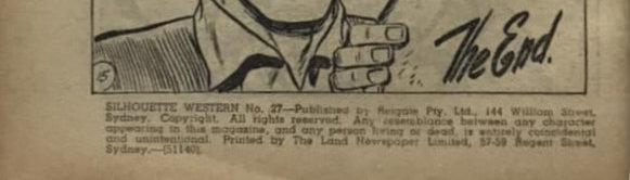 Silhouette Western No. 27--Published by Reigated Pty. Ltd., 144 William Street, Sydney. Copyright. All rights reserved. Any resemblance between any characters appearing in this magazine, and any person living or dead, is entirely coincidental and unintentional. Printed by The Land Newspaper Limited, 57-59 Regent Street, Sydney.--(51140)