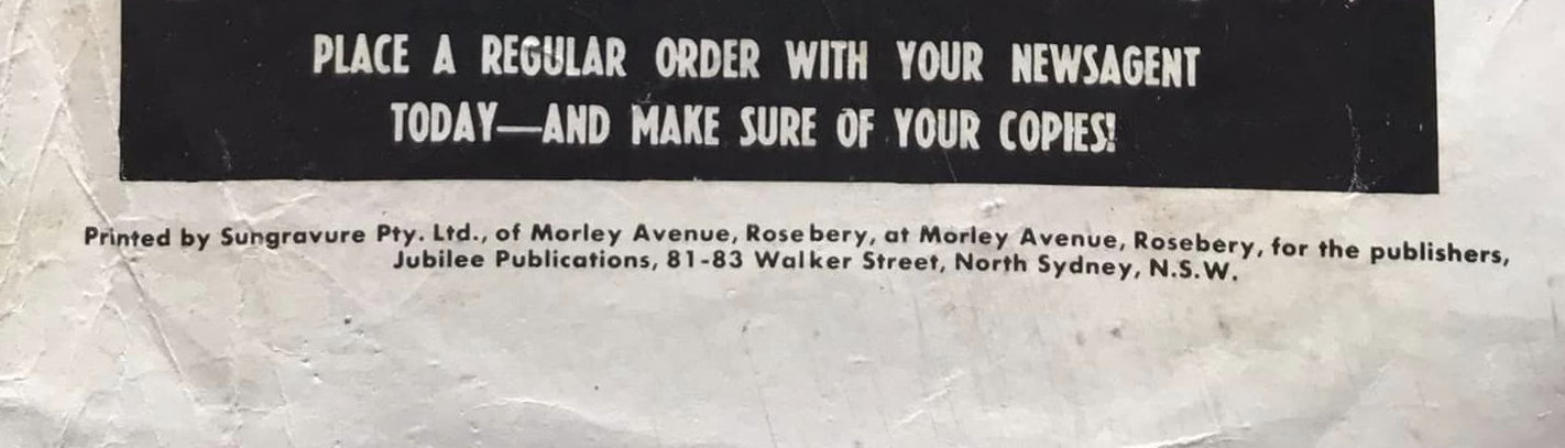 Printed by Sungravure Pty. Ltd., of Morley Avenue, Rosebery, at Morley Avenue, Rosebery, for the publishers, Jubilee Publications, 81-83 Walker Street, North Sydney, N.S.W.