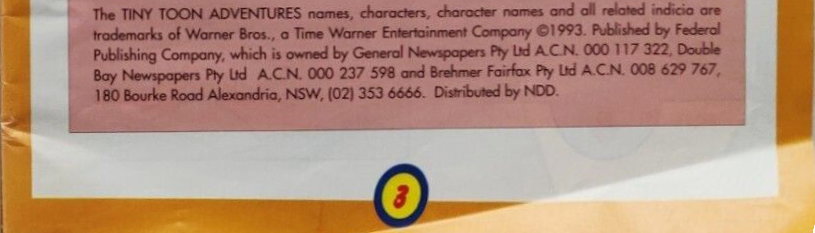 The Tiny Toon Adventures names, characters, character names and all related indicia are trademarks of Warner Bros., a Time Warner Entertainment Company © 1993. Published by Federal Publishing Company, which is owned by General Newspapers Pty Ltd A.C.N. 000 117 322, Double Bay Newspapers Pty Ltd A.C.N. 00 237 598 and Brehmer Fairfax Pty Ltd A.C.N. 008 629 767, 180 Bourke Road Alexandria, NSW, (02) 353 666. Distributed by NDD.