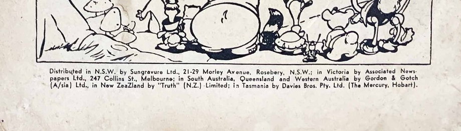 Distributed in N.S.W. by Sungravure Ltd., 21-29 Moreley Avenue, Rosebery, N.S.W.; in Victoria by Associated Newspapers Ltd., 247 Collins St., Melbourne; in South Australia, Queensland and Western Australia by Gordon & Gotch (A/sia) Ltd.; in New ZeaZland [sic] by "Truth" (N.Z.) Limited; in Tasmania by Davies Bros. Pty. Ltd. (The Mercury, Hobart).