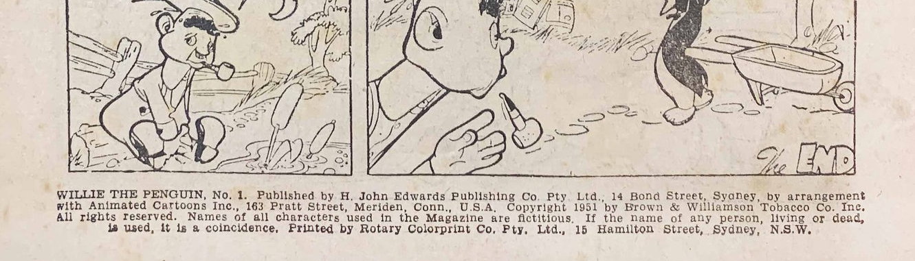 Wilie the Penguin, No. 1. Published by H. John Edwards Publishing Co. Pty. Ltd., 14 Bond Street, Sydney, by arrangement with Animated Cartoons Inc., 163 Pratt Street, Meriden, Conn., U.S.A. Copyright 1951 by Brown & Williamson Tobacco Co. Inc. All rights reserved. Names of all characters used in the Magazine are fictitious. If the name of any person, living or dead, is used, it is a coincidence. Printed by Rotary Colorprint Co. Pty. Ltd., 15 Hamilton Street, Sydney, N.S.W.