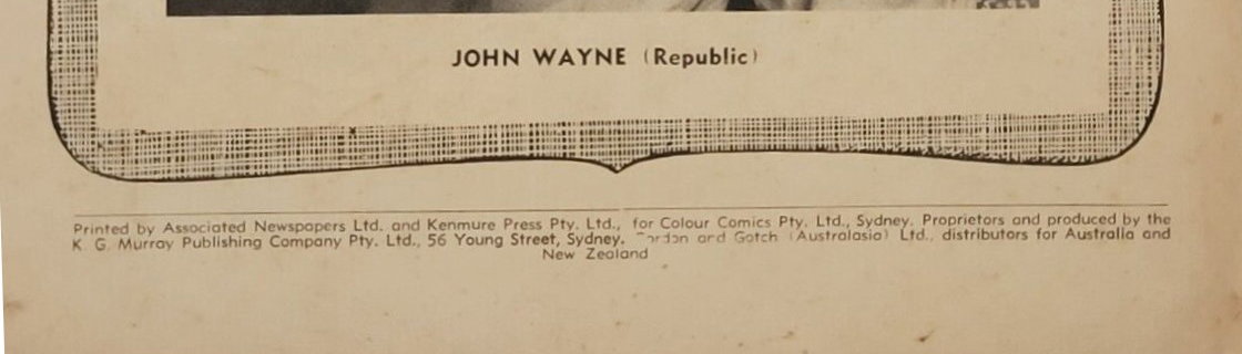 Printed by Associated Newspapers Ltd. And Kenmure Press Pty. Ltd., for Colour Comics Pty. Ltd., Sydney. Proprietors and produced by the K. G. Murray Publishing Company Pty. Ltd., 56 Young Street, Sydney. Gordon and Gotch (Australasia) Ltd., distributors for Australia and New Zealand.