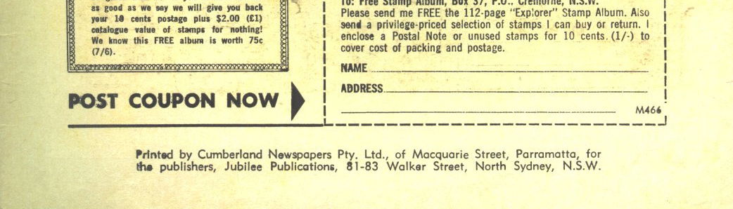 Printed by Cumberland Newspapers Pty. Ltd., of Macquarie Street, Parramatta, for the publishers, Jubilee Publications, 81-83 Walker Street, North Aydney, N.S.W.