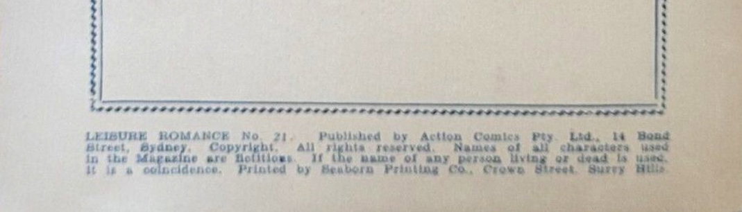 Leisure Romance NO. 21. Published by Action Comics Pty. Ltd., 14 Bond Street, Sydney. Copyright. All rights reserved. Names of all characters used in the Magazine are fictitious. If the name of any person living or dead is used, it is a coincidence. Printed by Seaborn Printing Co., Crown Street, Surry Hills.