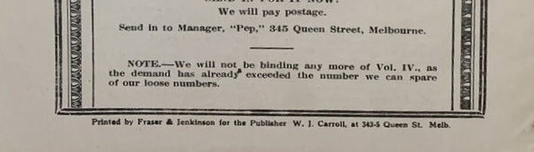 Printed by Fraser & Jenkinson for the Publisher W. J. Carroll, at 343-5 Queen St. Melb.