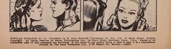 [Interior] Popular Romance No. 12. Published by H. John Edwards Publishing Co. Pty. Ltd., 14 Bond Street, Sydney. Copyright. All rights reserved by Better Publications Inc., 163 Pratt Street, Merident, Conn., U.S.A. Names of all characters used in this magazine are fictitious. If the name of any person living or dead is used, it is a coincidence. Printed by The Land Newspaper Ltd., 57-5? Regent St., Sydney.--(22866) [?]