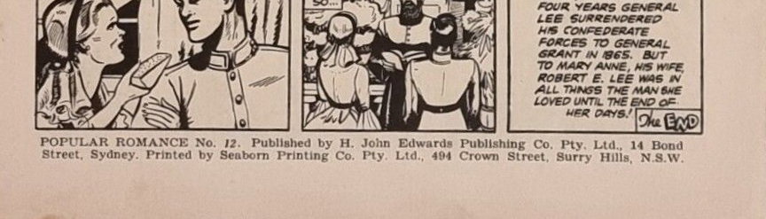 [Cover] Popular Romance No. 12. Published by H. John Edwards Publishing Co. Pty. Ltd., 14 Bond Street, Sydney. Printed by Seaborn Printing Co. Pty. Ltd., 494 Crown Street, Surry Hills, N.S.W.