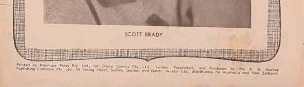 Printed by Kenmure Press Pty. Ltd., for Colour Comics Pty. Ltd., Sydney, Proprietors, and produced by the K. G. Murray Publishing Company Pty. Ltd., 56 Young Street, Sydney. Gordon and Gotch (A/sia) Ltd., distributors for Australia and New Zealand.
