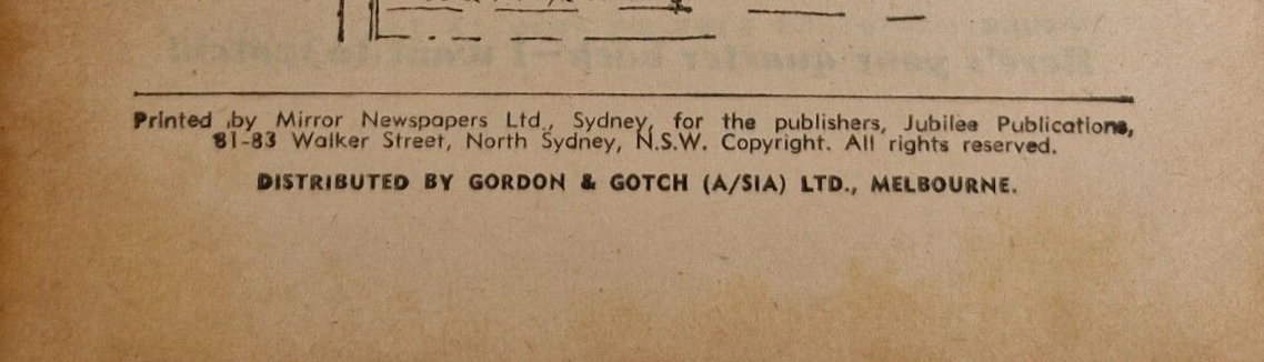 Printed by Mirror Newspapers Ltd., Sydney, for the publishers Jubilee Publications, 81-83 Walker Street, North Sydney, N.S.W. Copright. All rights reserved. Distributed by Gordon & Gotch (A/sia) Ltd., Melbourne.