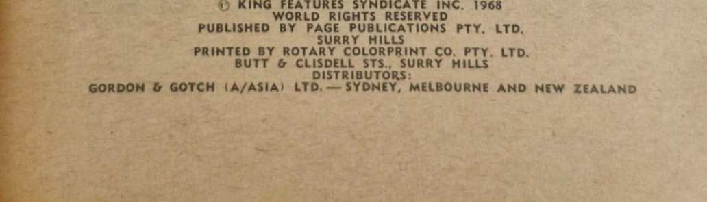 © King Features Syndicate Inc. 1968 World rights reserved. Published by Page Publications Pty. Ltd. Surry Hills. Printed by Rotary Colorprint Co. Pty. Ltd. Butt & Clisdell Sts., Surry Hills. Distributors: Gordon & Gotch (A/asia) Ltd.--Sydney, Melbourne and New Zealand.