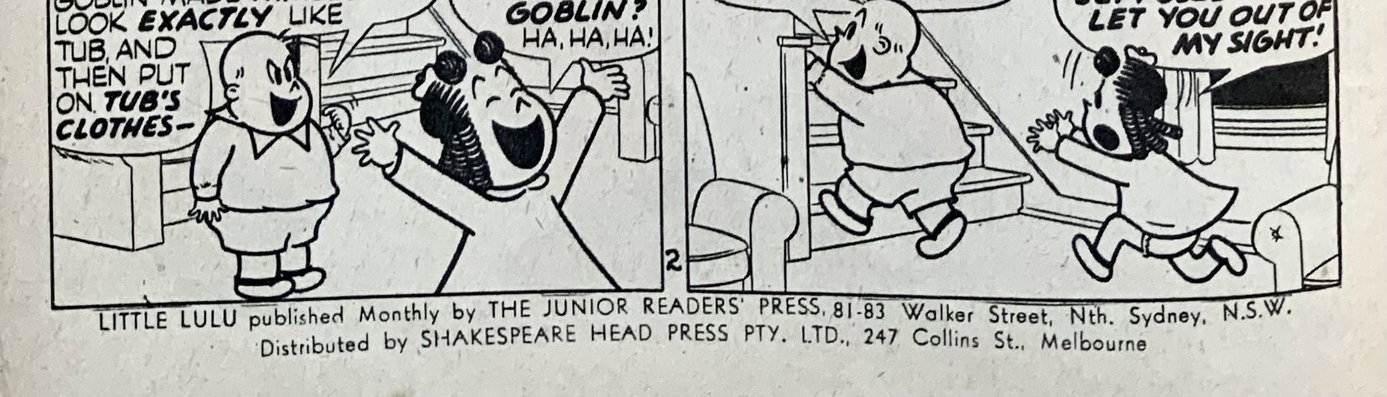 Little Lulu published montly by The Junior Readers' Press, 81-83 Walker Street, Nth. Sydney, N.S.W. Distributed by Shakespeare Head Press Pty. Ltd., 247 Collins St., Melbourne. This edition drawn and printed in Australia by Jayar Studios and Conpress Printing Limited. Copyright 1956 by Marjorie Henderson Buell. All righs reserved throughout the world. Published by arrangement with Western Printing & Lithographing Co., Racine, Wis., U.S.A., producers of the U.S.A. and canandian editions, published by Dell Publishing Co.