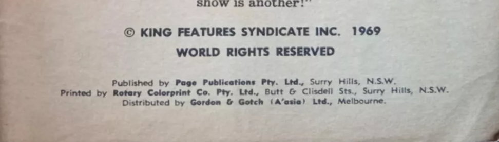 © King Features Syndicte Inc. 1969. World Rights Reserved. Published by Page Publications Pty. Ltd., Surry Hills, N.S.W. Printed by Rotary Colorprint Co. Pty. Ltd., Butt & Clisdell Sts., Surry Hills, N.S.W. Distributed by Gordon & Gotch (A'asia) ltd., Melbourne.