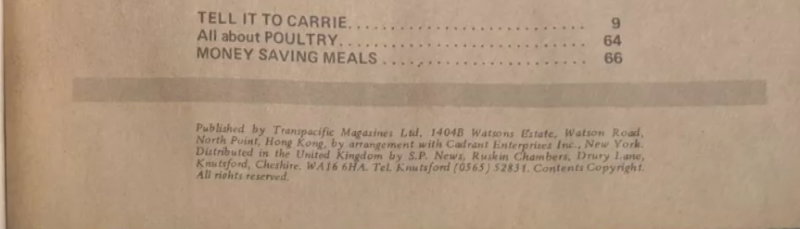Published by Transpacific Magazines Ltd. 1404B Watsons Estate, Watson Road, North Point, Hong Kong, by arrangement with Cadrant Enterprises Inc., New York. Distributed in thye United Kingdom by S.P. News, Ruskin Chambers, Drury Lane, Knutsford, Cheshire. WA16 6HA. Tel, Knutsford (0565) 52831. Contents Copyright. All rights reserved.