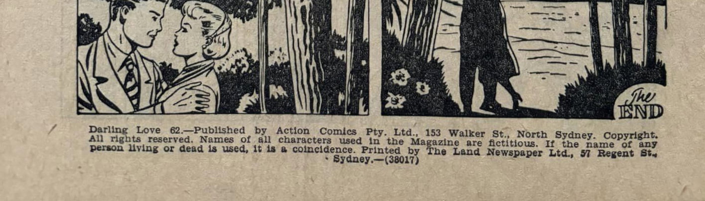 Darling Love 62.--Published by Action Comics Pty. Ltd., 153 Walker St., North Sydney. Copyright. All rights reserved. Names of all characters used in the Magazine are fictitious. If the name of any person living or dead is used, it is a coincidence. Printed by The Land Newspaper Ltd., 57 Regent St., Sydney.--(38017)