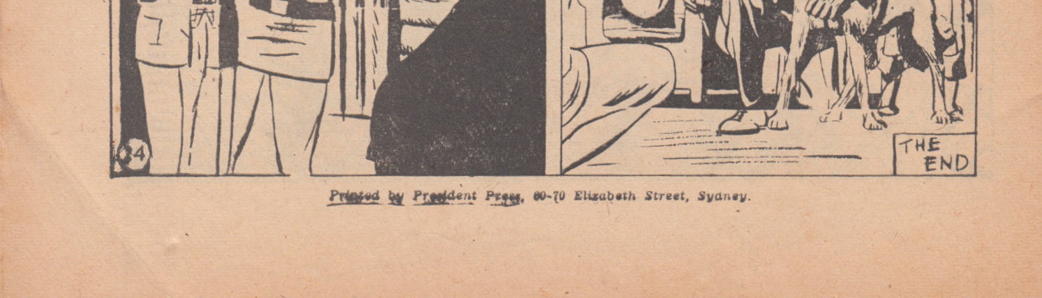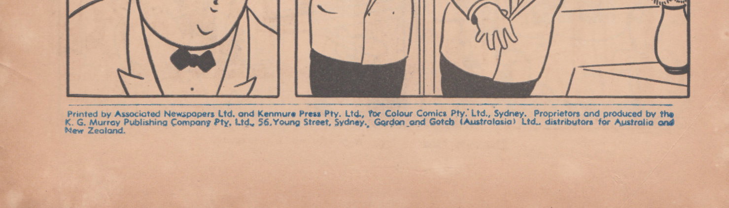 Printed by Associated Newspapers Ltd. and Kenmure Press Pty. Ltd., for Colour Comics Pty. Ltd., Sydney. Proprietors and produced by the K. G. Murray Publishing Company Pty. Ltd., 56 Young Street, Sydney. Gordon and Gotch (Australasia) Ltd., distributors for Australia and New Zealand.