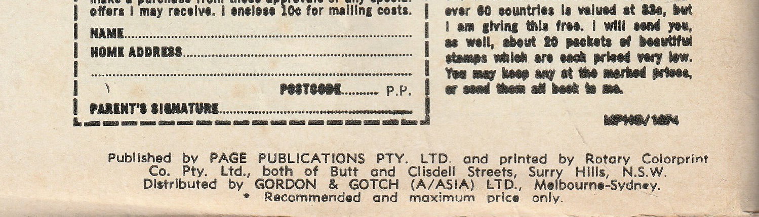 Published by Page Publications Pty. Ltd. And printed by Rotary Colorprint Co. Pty. Ltd., both of Butt and Clisdell Streets, Surry Hills, N.S.W. Distributed by Gordon & Gotch (A/asia) Ltd., Melbourne-Sydney.