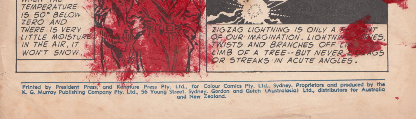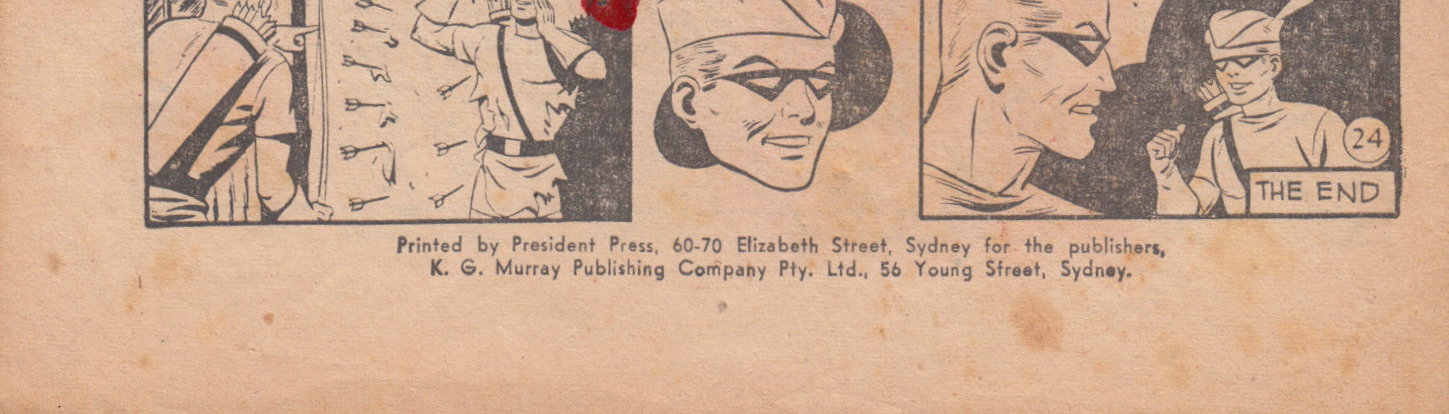 [Interior] Printed by President Press, 60-70 Elizabeth Street, Sydney for the publishers, K.G. Murray Publishing Company Pty. Ltd., 56 Young Street, Sydney. [Cover] Printed by President Press, and Kenmure Press Pty. Ltd., for Colour Comics Pty. Ltd., Sydney. Proprietors and produced by the K. G. Murray Publishing Company Pty. Ltd., 56 Young Street, Sydney. Gordon and Gotch (Australasia) Ltd., distributors for Australia and New Zealand.
