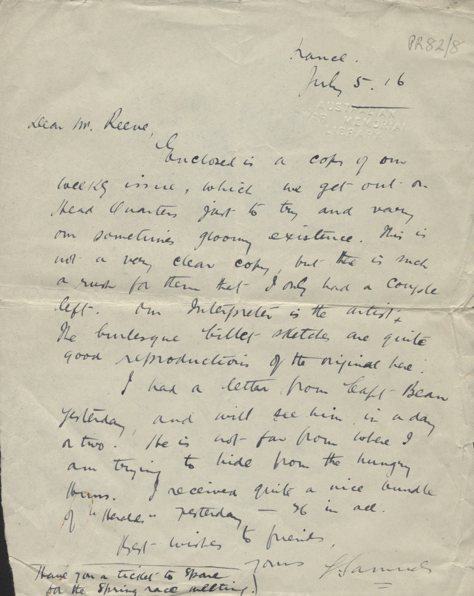 Sourced from www.awm.gov.au/collection/C2482187: 'The letter talkes about an enclosed newspaper made by soldiers to try to imporve their mood. Attached to the letter is the trench Newspaper “The Headquarters Periscope” 3 July 1916, edited by Cyril Charles Bentley Samuels and piece of card with the name and details of Cyril Samuels.'