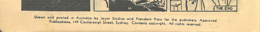 Drawn and printed in Australia by Jayar Studios and President Press for the publishers, Approved Publications, 149 Castlereagh Street, Sydney. Contents copyright. All rights reserved. Distributed throughout Australia by Gordon & Gotch (A/sia) Ltd. All names used throughout are fictitious and do not refer to any living person.