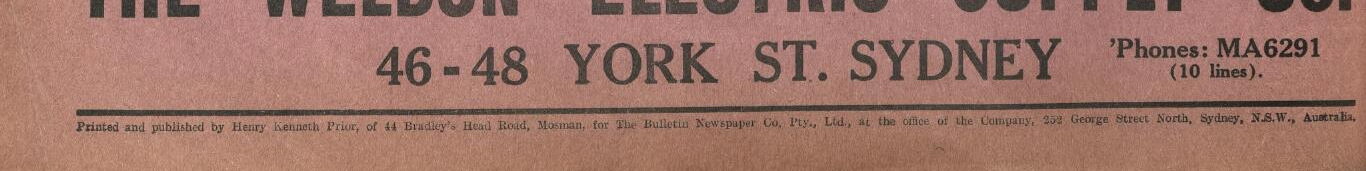 Printed and published by Henry Kenneth Prior, of 44 Bradley's Head Road, Mosman, for The Bulletin Newspaper Co. Pty., Ltd, at the office of the Company, 252 George Street North, Sydney, N.S.W., Australia.