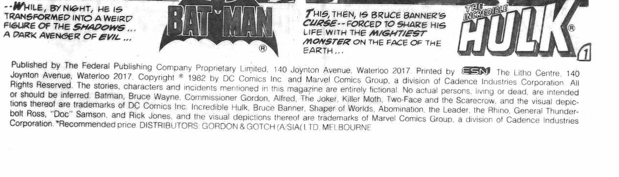 The original was a large "treasury-size" comic. This is possibly the first Marvel character reprinted by Federal, prior to taking over the Australian Marvel rights. The majority of this issue's indica is based on the original US comic. Despite the 1982 copyright date, the earliest Federal Comics were released in 1983.