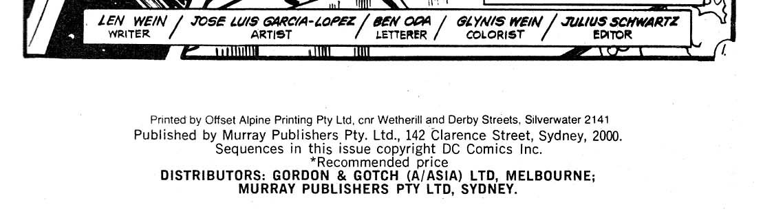 Printed by Offset Alpine Printing Pty Ltd, cnr Wetherill and Derby Streets, Silverwater 2141. Published by Murray Publishers Pty. Ltd., 142 Clarence Street, Sydney, 2000. Sequences in this issue copyright DC Comics Inc. Distributors: Gordon & Gotch (A/asia) Ltd., Melbourne; Murray Publishers Pty. Ltd., Sydney.