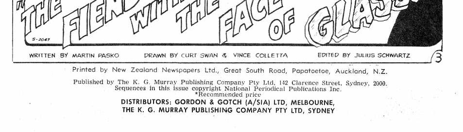 Printed by New Zealand Newspapers Ltd., Great South Road, Papatoetoe, Auckland, N.Z. Published by The K. G. Murray Publishing Company Pty Ltd, 142 Clarence Street, Sydney, 2000. Sequences in this issue copyright National Periodical Publications Inc. Distributors: Gordon & Gotch (A/sia) Ltd, Melbourne, The K. G. Murray Publishing Company Pty Ltd, Sydney.