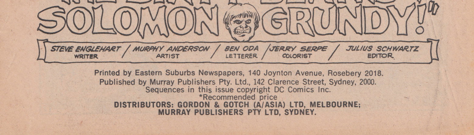Printed by Eastern Suburbs Newspapers, 140 Joynton Avenue, Rosebery 2018. Published by Murray Publishers Pty Ltd, 142 Clarence Street, Sydney, 2000. Sequences in tthis issue copyright DC Comics Inc. Distributors: Gordon & Gotch (A/asia) Ltd., Melbourne; Murray Publishers Pty Ltd, Sydney.