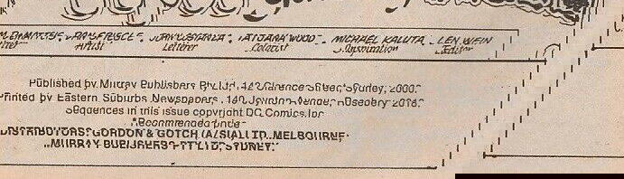 Published by Murray Publishers Pty Ltd, 142 Clarence Street, Sydney, 2000. Printed by Eastern Suburbs Newspapers, 77 Belmore Rd., Randwick, NSW. Sequences in this issue copyright DC Comics Inc. Distributors: Gordon & Gotch (A/asia) Ltd., Melbourne; Murray Publishers Pty Ltd, Sydney.