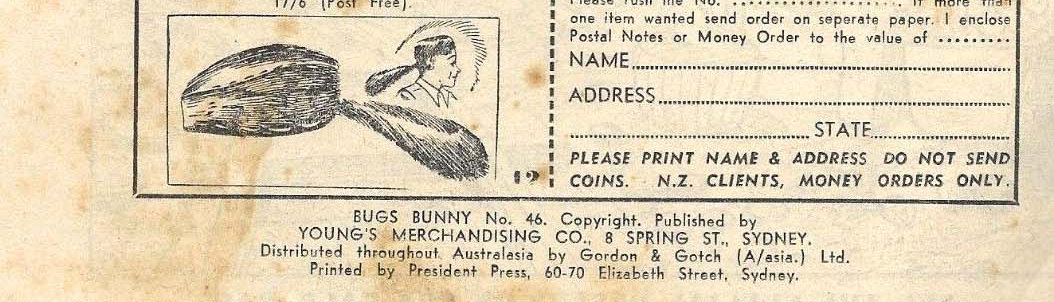 Bugs Bunny No. 46. Copyright. Published by Young's Merchandising Co., 8 Spring St., Sydney. Distributed throughout Australasia by Gordon & Gotch (A/asia) Ltd. Printed by President Press, 60-70 Elizabeth St Sydney.
