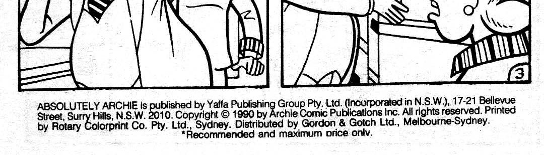 Absolutely Archie is published by Yaffa Publishing Group Pty. Ltd. (Incorporated in N.S.W.), 17-21 Bellevue Street, Surry Hills, N.S.W. 2010. Copyright © 1990 by Archie Comic Publications Inc. All rights reserved. Printed by Rotary Colorprint Co. Pty. Ltd., Sydney. Distributed by Gordon & Gotch Ltd., Melbourne-Sydney.