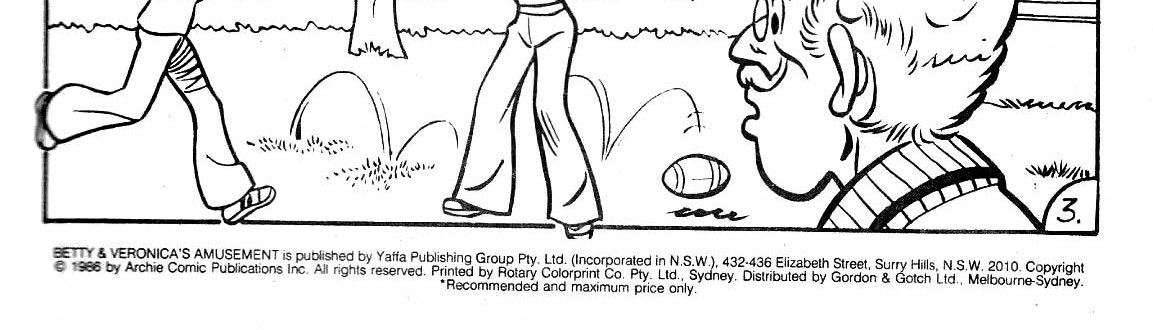 Betty & Veronica's Amusement is published by Yaffa Publishing Group Pty. Ltd. (Incorporated in N.S.W.), 432-436 Elizabeth Street, Surry Hills, N.S.W. 2010. Copyright © 1986 by Archie Comic Publications Inc. All rights reserved. Printed by Rotary Colorprint Co. Pty. Ltd., Sydney. Distributed by Gordon & Gotch Ltd., Melbourne-Sydney.