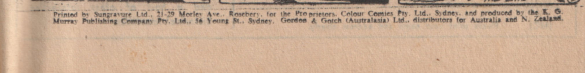 Printed by Sungravure Ltd., 21-29 Morley Ave. Rosebery, for the Proprietors, Colour Comics Pty. Ltd., Sydney, and produced by the K. G. Murray Publishing Company Pty. Ltd., 56 Young St., Sydney. Gordon & Gotch (Australasia) Ltd., distributors for Australia and N. Zealand.