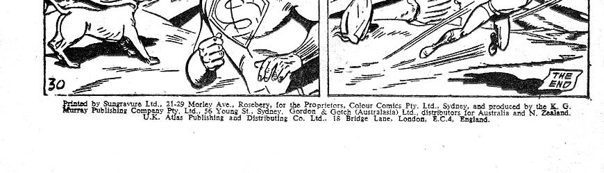 Printed by Sungravure Ltd., 21-29 Morley Ave., rosebery, for the Proprietors, Colour Comics Pty. Ltd., Sydney, and produced by the K. G. Murray Publishing Company Pty, Ltd., 56 Young St., Sydney. Gordon & Gotch (Australasia) Ltd., distributors for Australia and N. Zealand. U.K. Atlas Publishing and Distributing Co. Ltd., 18 Bridge Lane, London, E.C.4, England.
